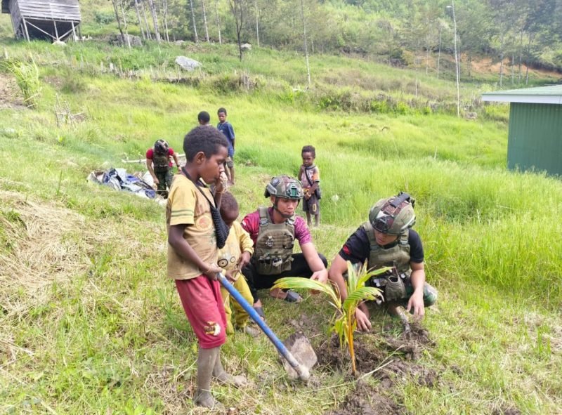 Wuloni Papua, Beritafakta.id – Di balik hijaunya lembah dan pegunungan Papua yang menjulang, sebuah langkah kecil namun sarat makna dilakukan oleh prajurit Satgas Pamtas RI-PNG Yonif 700/Wira Yudha Cakti. Melalui Pos Wuloni, para prajurit bersama masyarakat Kampung Wuloni, Distrik Ilaga Utara, Kabupaten Puncak, menggelar kegiatan penanaman pohon kelapa untuk pertama kalinya di daerah tersebut, (2/7/2025).
