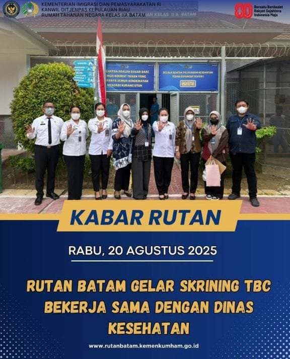 Batam, beritafakta.id – Rumah Tahanan Negara Kelas IIA Batam bersama Dinas Kesehatan Provinsi Kepulauan Riau dan Dinas Kesehatan Kota Batam melaksanakan kegiatan skrining Tuberkulosis (TBC) bagi warga binaan, Rabu (20/08/2025).Kegiatan ini merupakan langkah nyata dalam mendukung program pemerintah untuk menekan angka penyebaran TBC, khususnya di lingkungan pemasyarakatan yang memiliki risiko tinggi.