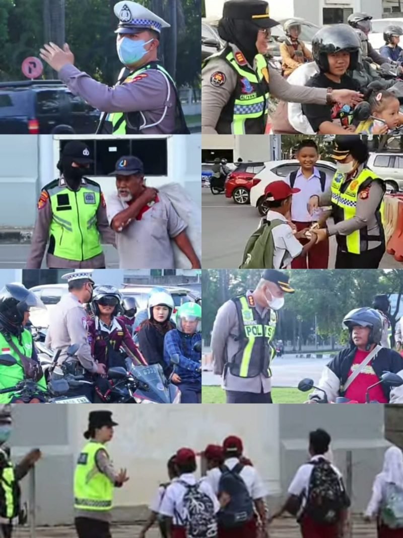 Selain membantu pengaturan arus lalu lintas dan menyeberangkan warga, kehadiran petugas kepolisian di jalan raya bertujuan menciptakan rasa aman dan nyaman bagi masyarakat pengguna jalan.