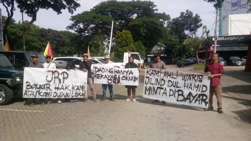 Didampingi oleh kuasa hukum ahli waris, Guruh Pramono, S.H., para peserta aksi membentangkan sejumlah spanduk bertuliskan tuntutan mereka, antara lain “JRP Bayar Hak Kami atau Kami Duduki Lokasi” dan “Kami Ahli Waris Jilind Dul Hamid Hanya Minta Dibayar.”