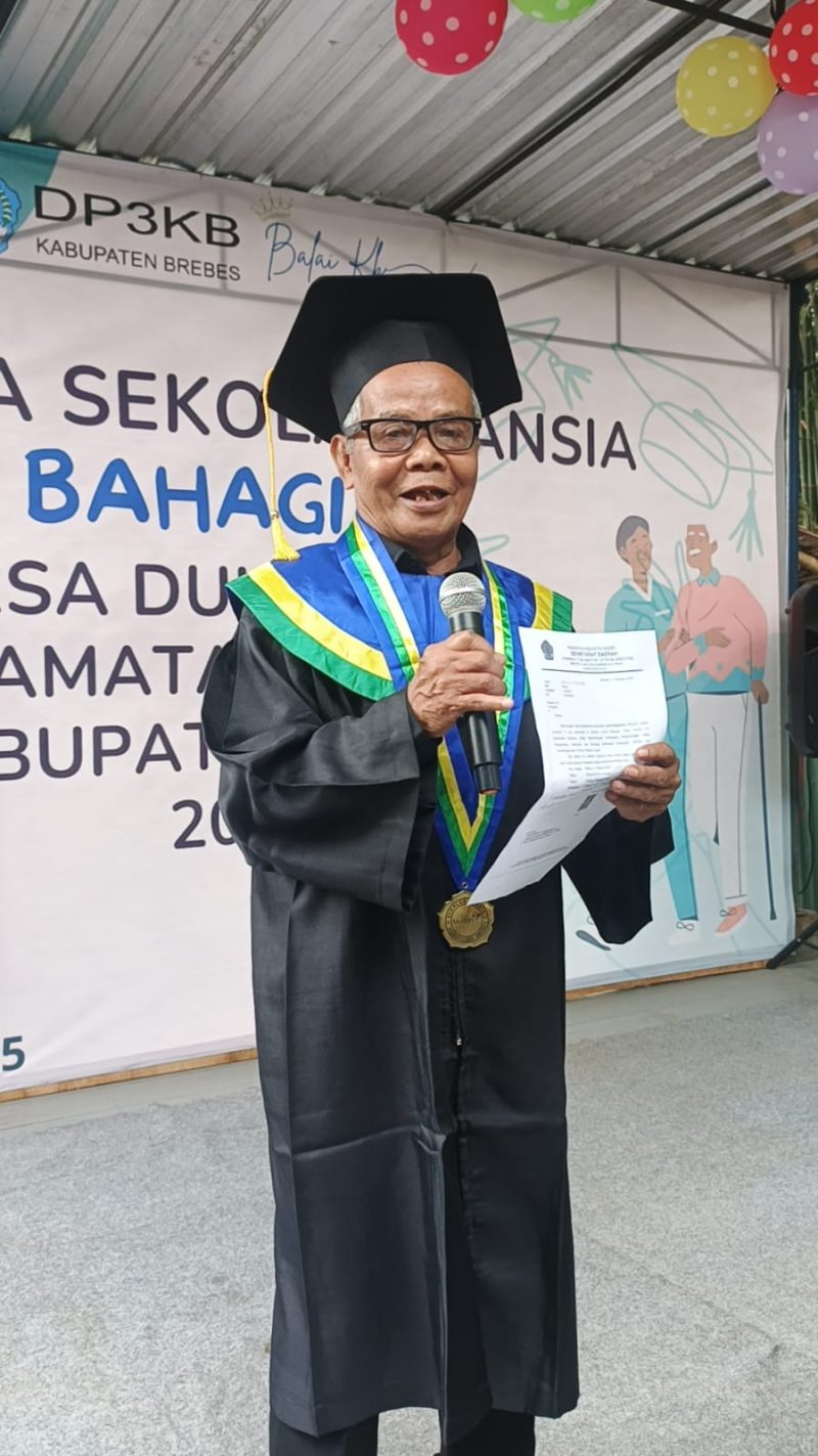 Brebes, – ‎Sebanyak 79 lansia mengikuti prosesi wisuda Sekolah Lansia Bahagia Desa Dukuhturi, Kecamatan Bumiayu, Kabupaten Brebes, di Posyandu Lansia Maju Sejahtera Dukuhturi Bumiayu, Selasa (21/10/2025). Dari puluhan peserta tersebut, Mbah Kaidi (84) dinobatkan sebagai mahasiswa tertua sekaligus lulusan terbaik.
