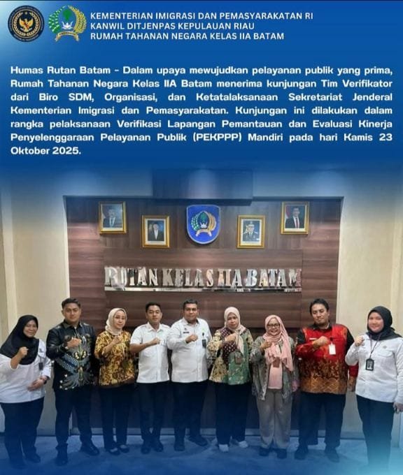 Dalam upaya mewujudkan pelayanan publik yang prima dan berintegritas, Rumah Tahanan Negara (Rutan) Kelas IIA Batam menerima kunjungan Tim Verifikator dari Biro SDM, Organisasi, dan Ketatalaksanaan Sekretariat Jenderal Kementerian Hukum dan HAM (Kemenkumham).