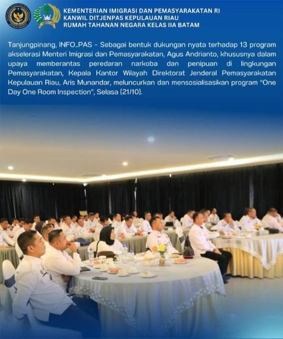 Tanjungpinang – Komitmen untuk mewujudkan lembaga pemasyarakatan yang bersih dari narkoba terus digaungkan Kantor Wilayah Direktorat Jenderal Pemasyarakatan (Kanwil Ditjen PAS) Kepulauan Riau. Kepala Kanwil, Aris Munandar, resmi meluncurkan program inovatif bertajuk “One Day One Room Inspection” pada Selasa (21/10).