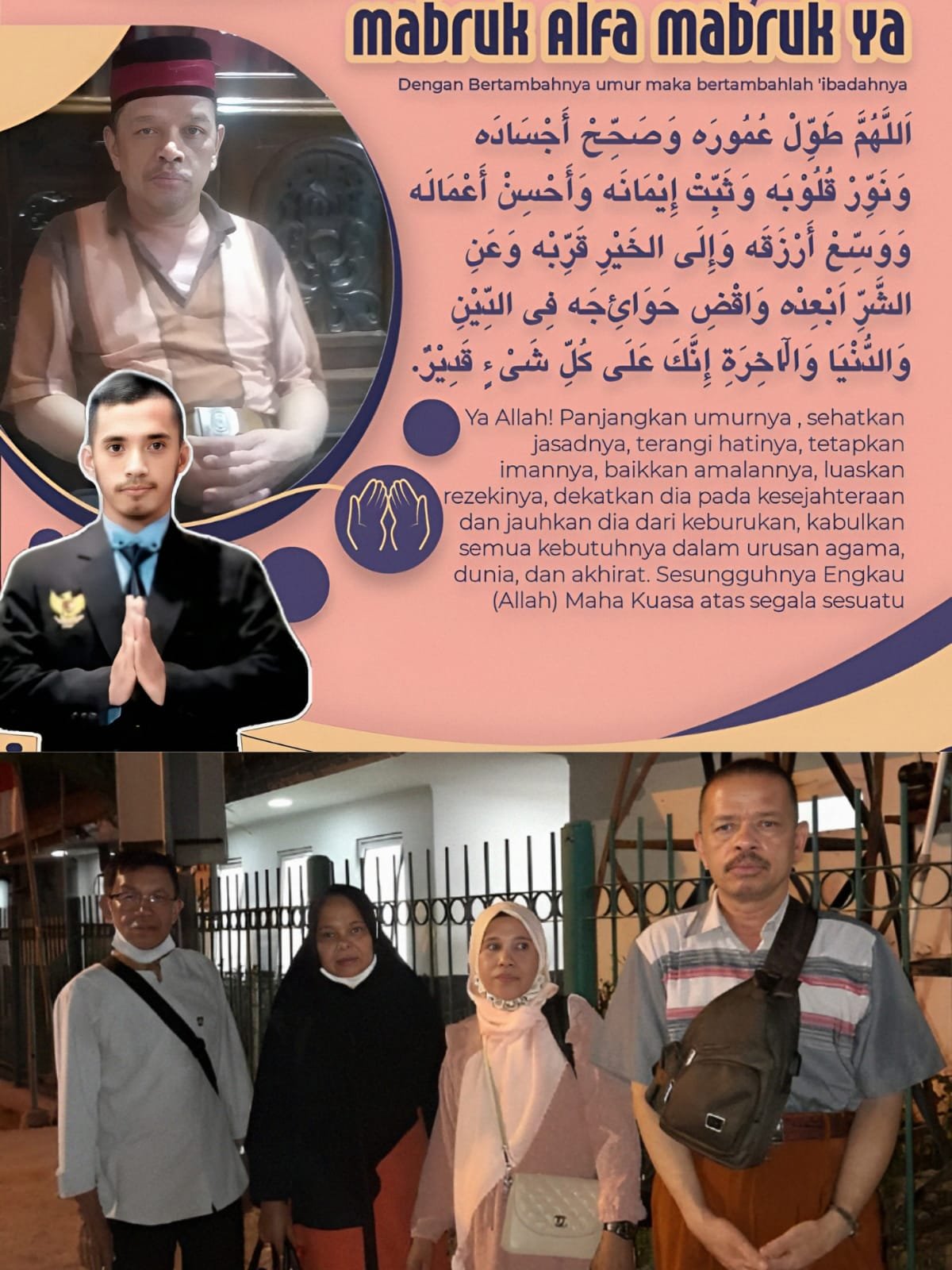 Ya Allah! Panjangkan umurnya, sehatkan lah jasadnya, terangi hatinya, tetapkanlah iman nya, baikkan amalan nya, luaskan rezekinya, dekatkan dia pada kesejahteraan, dan jauhkan dia dari keburukan, kabulkan semua kebutuhannya dalam urusan agama, dunia, dan akhirat, Sesungguhnya engkau (Allah) Maha Kuasa atas segala sesuatu,” Pungkas Nya