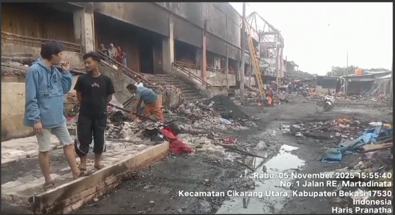 Kabupaten Bekasi — Sehari pasca kebakaran hebat yang melanda kawasan Pasar Cikarang di Jalan RE Martadinata, Cikarang Utara, Kabupaten Bekasi, pada Selasa (4/11/2025) kemarin, dan terpantau situasi kondisi terkini pada Rabu (5/11/2025) pantauan media di lokasi masih dipenuhi puing-puing dan sisa-sisa bangunan yang hangus terbakar.