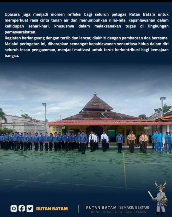 Upacara peringatan Hari Pahlawan dengan tema “Pahlawanku Teladanku, Terus Bergerak Melanjutkan Perjuangan” ini juga menjadi momen refleksi bagi seluruh petugas Rutan Batam. Para peserta diajak memperkuat rasa cinta tanah air dan menumbuhkan nilai-nilai kepahlawanan dalam kehidupan sehari-hari, terutama dalam pelaksanaan tugas di lingkungan pemasyarakatan.