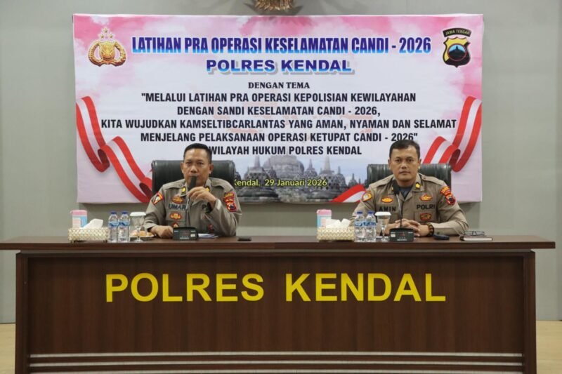 KENDAL – Menjelang pelaksanaan Operasi Ketupat Candi 2026, Polres Kendal menggelar kegiatan Latihan Pra Operasi Keselamatan Candi 2026. Kegiatan ini berlangsung di Aula Tri Brata Polres Kendal pada Kamis (29/01/2026) pagi, dengan mengusung tema “Melalui Latihan Pra Operasi Kepolisian Kewilayahan Dengan Sandi Keselamatan Candi – 2026, Kita Wujudkan Kamseltibcarlantas Yang Aman, Nyaman dan Selamat”.