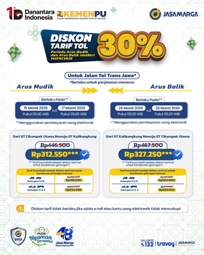 Potongan tarif tersebut berlaku selama dua hari pada periode arus mudik, yakni 15–16 Maret 2026 (H-6 sampai H-5 Lebaran), serta dua hari pada periode arus balik, yaitu 26–27 Maret 2026 (H+5 sampai H+6 Lebaran).