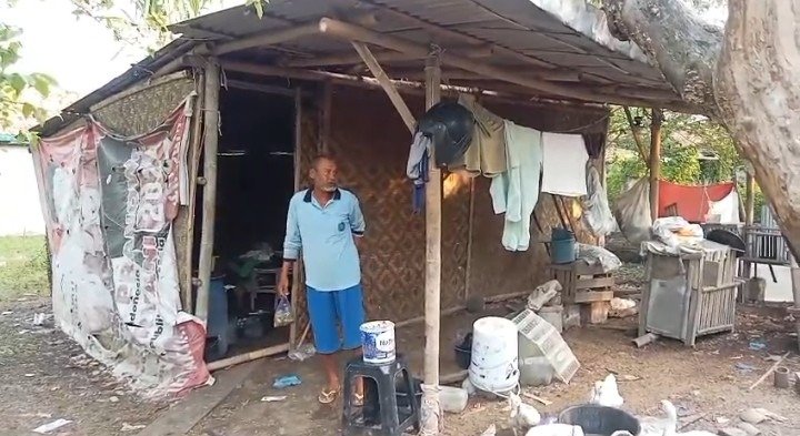 Sudah lebih dari empat tahun, ia menempati gubuk berdinding geribik dan berlantai tanah yang berdiri berdampingan dengan area bekas pemakaman keluarga serta kandang entok.